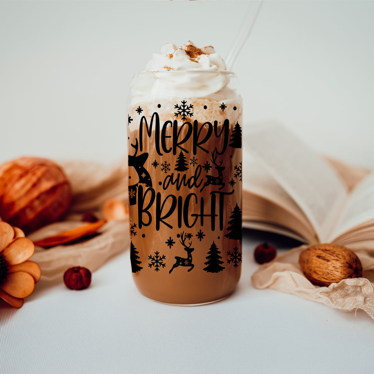 Introducing our 'Merry & Bright' cup, the perfect blend of classic holiday charm and bold style. With its striking black lettering and traditional reindeer, snowflake, and Christmas tree graphics, this cup is your ultimate holiday companion that won't be missed.