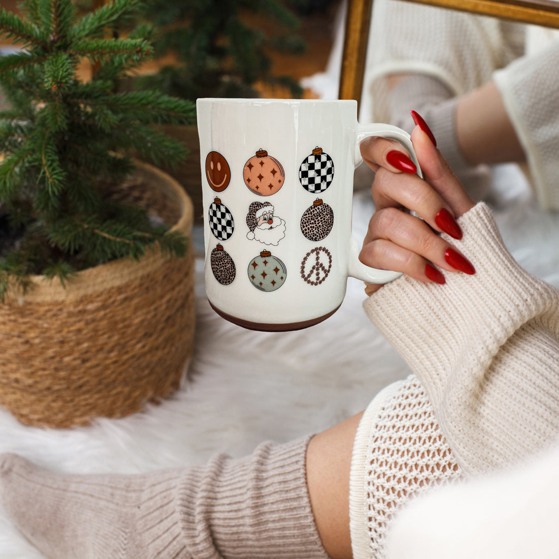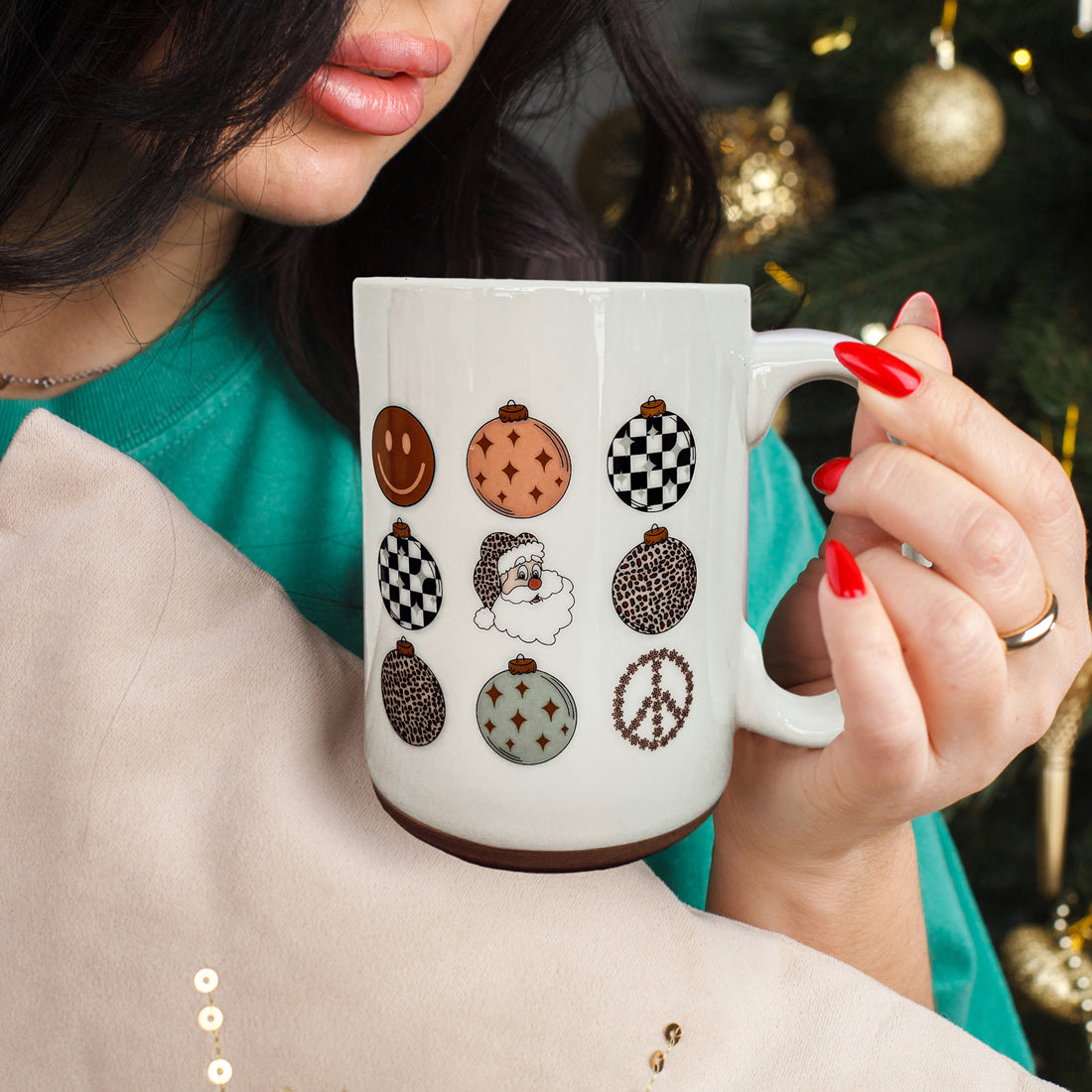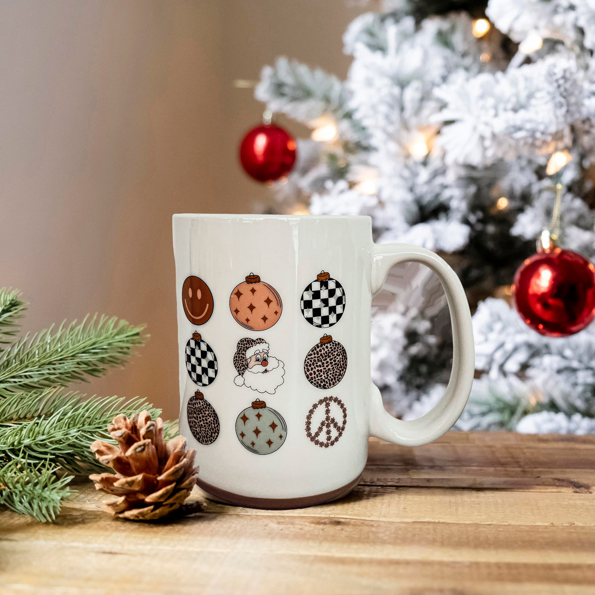 This double-sided mug captures the essence of a classic holiday celebration with a modern mom’s sense of humor. Both sides showcases the colorful ornaments in all their retro glory,.
