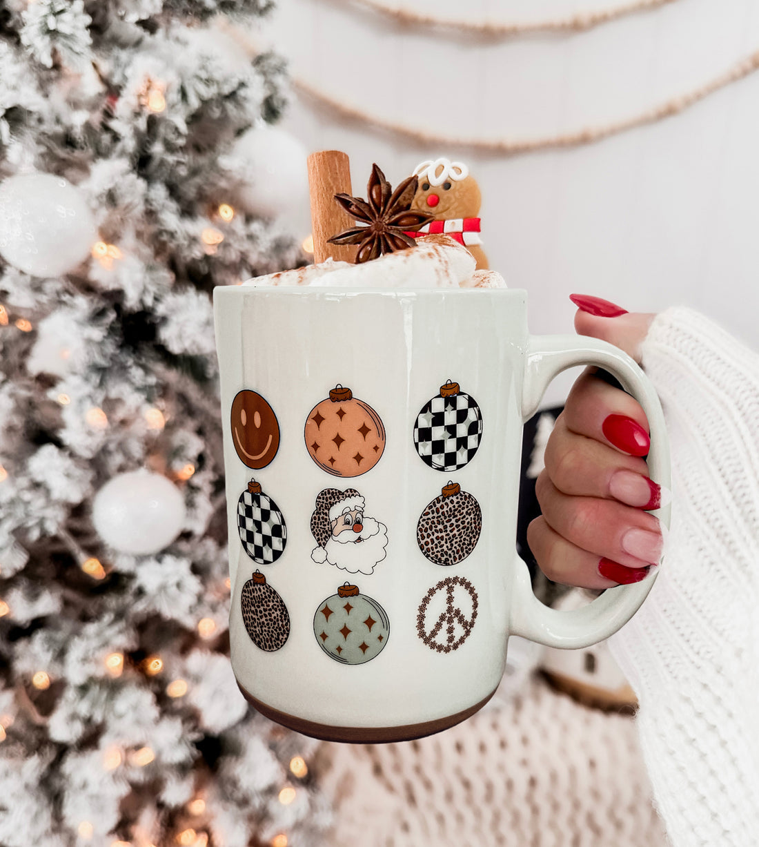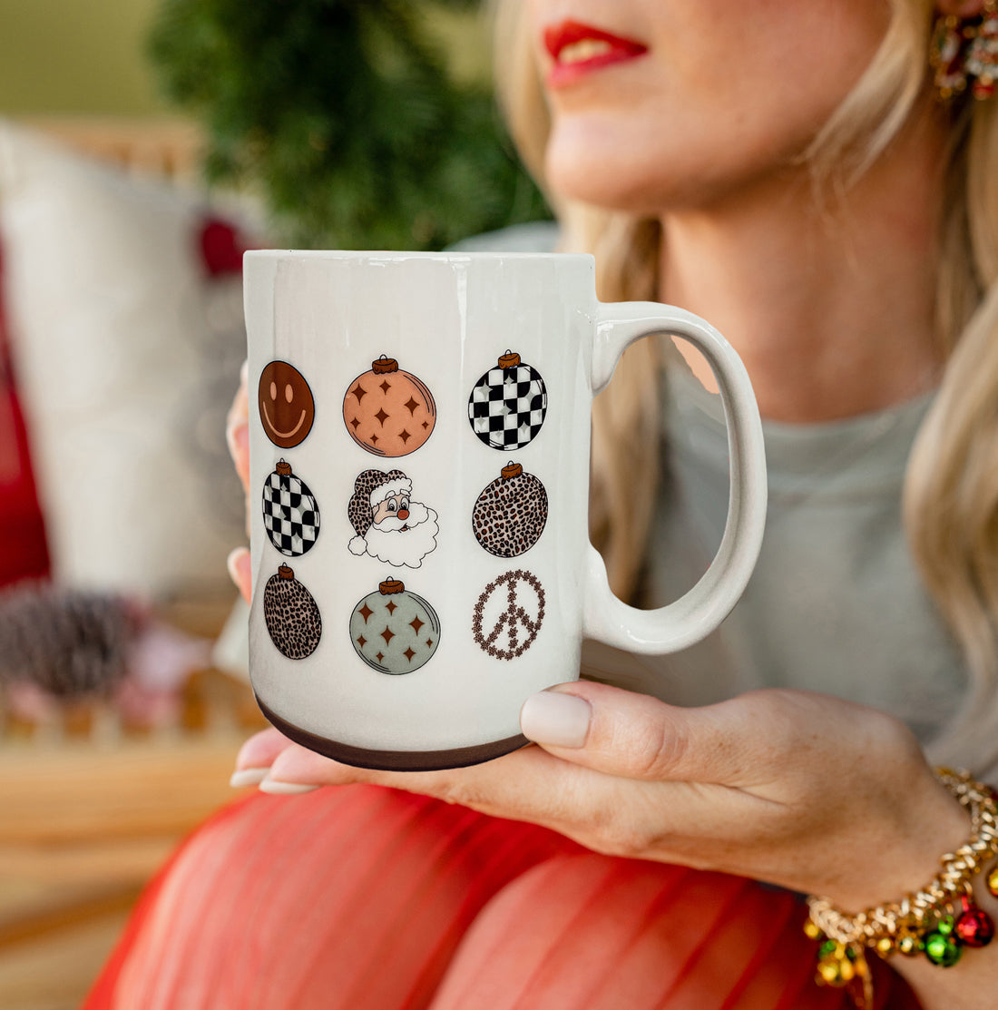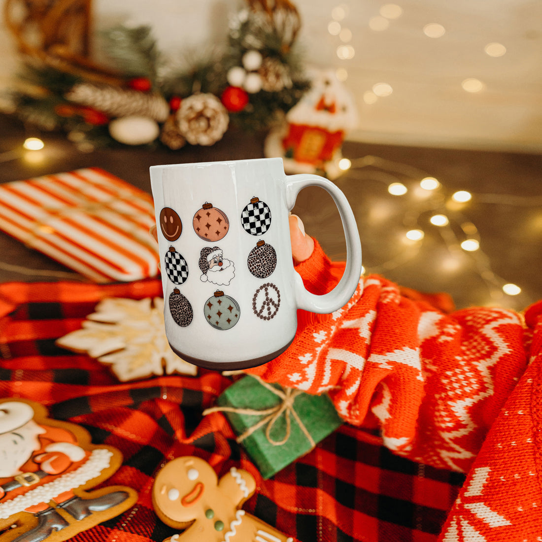 Get ready to add a touch of vintage charm to your holiday season with our Retro Style Christmas Ceramic Coffee Mug! Perfect for those who love a nostalgic twist on festive fun, this mug is adorned with nine delightful circle ornaments, each featuring a unique design like Santa, a smiley face, a peace sign, and more.